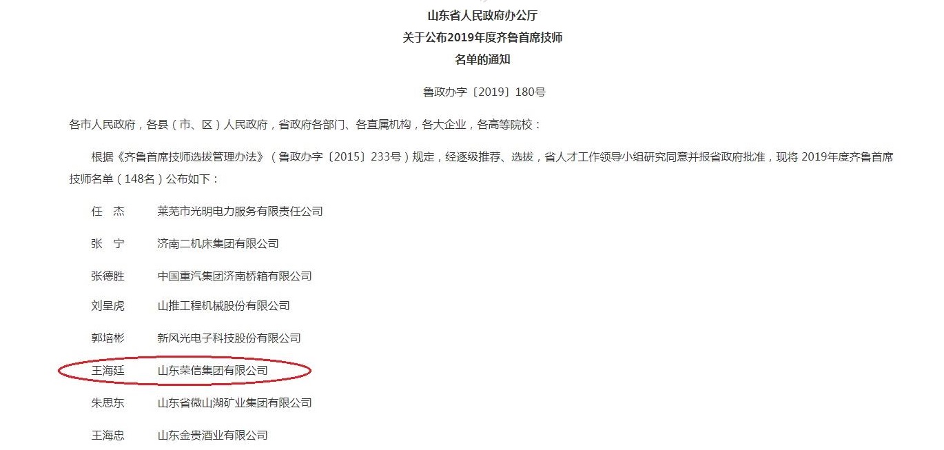日前,山東省政府辦公廳發布《關于公布2019年度齊魯首席技師名單的通知》,共選出148名2019年度齊魯首席技師。集團選拔推薦的動力分廠廠長王海廷成功入選。